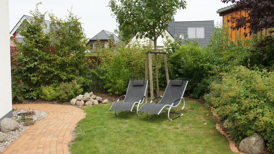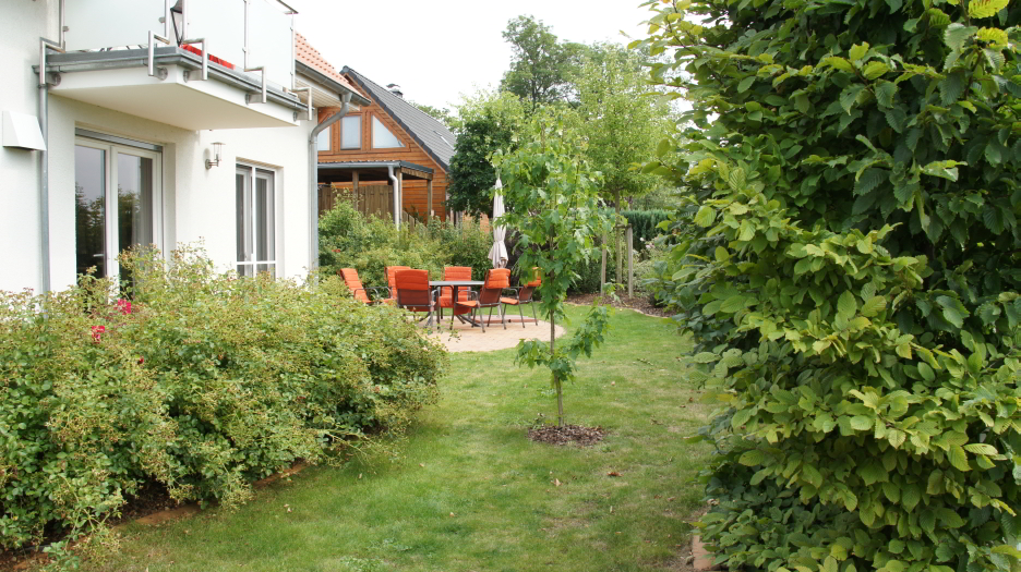 Die mit Gartenmöbeln, einem großen Ampelsonnenschirm und einem Grill gut ausgestattete Terrasse lädt zum Aufenthalt im Freien ein. Sie führt um das Haus herum und bietet Ihnen Sonnenschein von morgens bis abends. Im schön angelegten Garten können Sie Ihre Seele baumeln lassen.