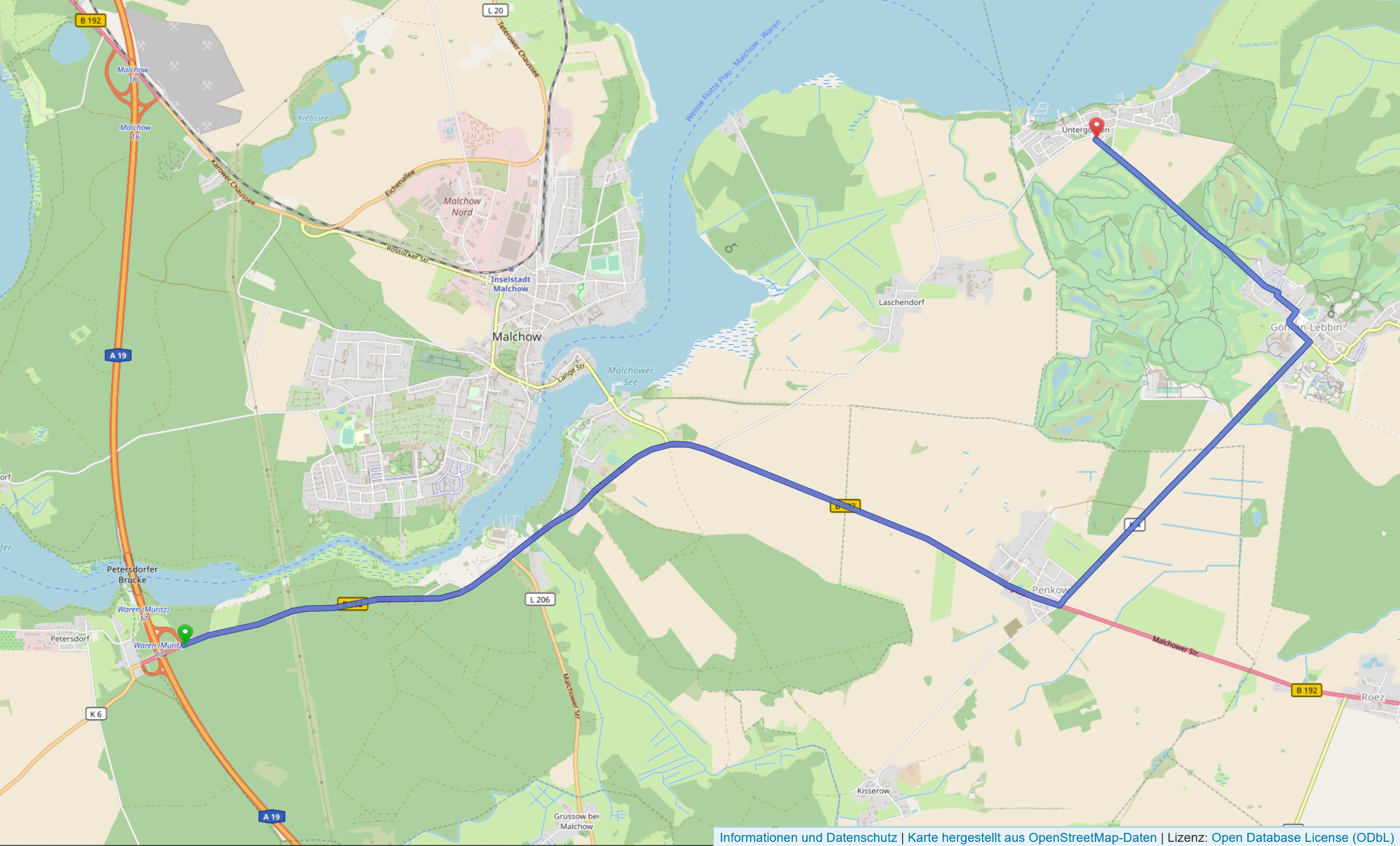 Screenshot einer Route von der Ausfahrt 17 Waren (Müritz) / Göhren-Lebbin zum Ferienhaus mit routing.openstreetmap.de.