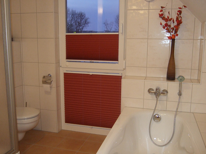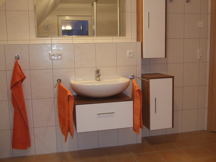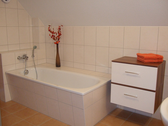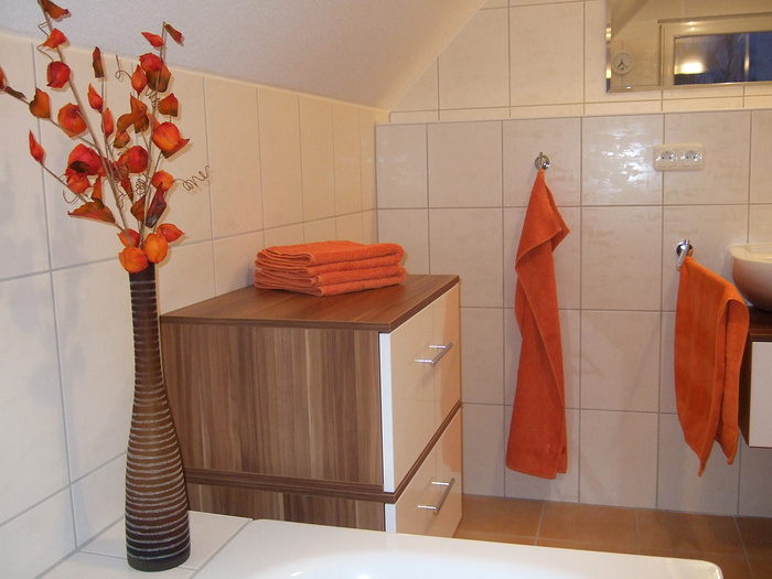 Das Bad im Obergeschoss verfügt über eine Badewanne, eine Dusche und ein WC. Mehrere Badezimmerschränke können Ihre Kosmetikartikel und Badeutensilien problemlos aufnehmen. Ein Föhn ist vorhanden.