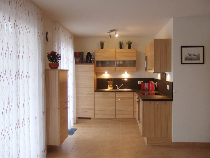 Die offene Küche ist komplett ausgestattet mit einem Herd mit Backofen und Ceranfeld, Geschirrspüler, Mikrowelle, Kühlschrank mit Tiefkühlfach, Kaffeemaschine, Kaffeepadmaschine, Wasserkocher, Toaster und vieles mehr. Durch die offene Form haben Sie von hier aus alles im Blick.