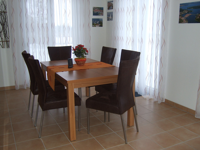 Daran schließt sich der Essbereich mit einem großen Esstisch und 6 bequemen Stühlen an.
